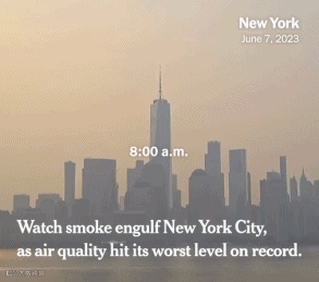 据美国各大媒体的报道, 加拿大山火浓烟对美国的影响正在不断蔓延,到周三(6月7日)上午,已有 13 个州发布空气质量警报,当天全美空气质量最差的地区是纽约州从雪城到宾汉姆顿的沿线地区。