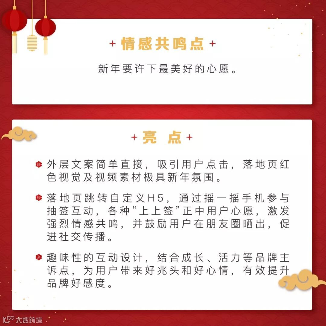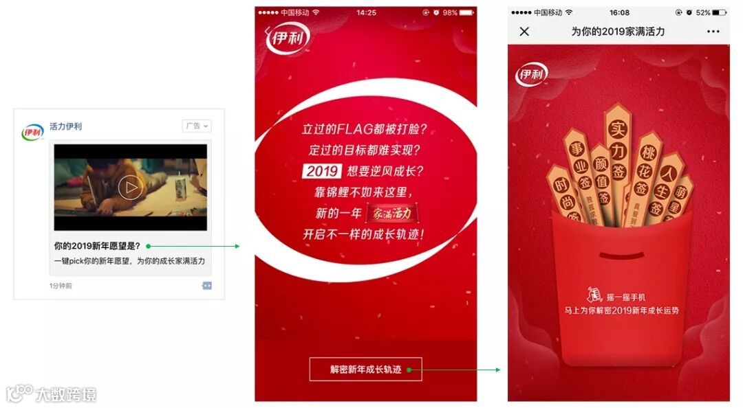 伊利将新年许愿做成了互动抽签小游戏,无论是升职加薪还是喜提马甲线,怎么抽都是上上签,越互动越开心,让用户感受到伊利的正能量。