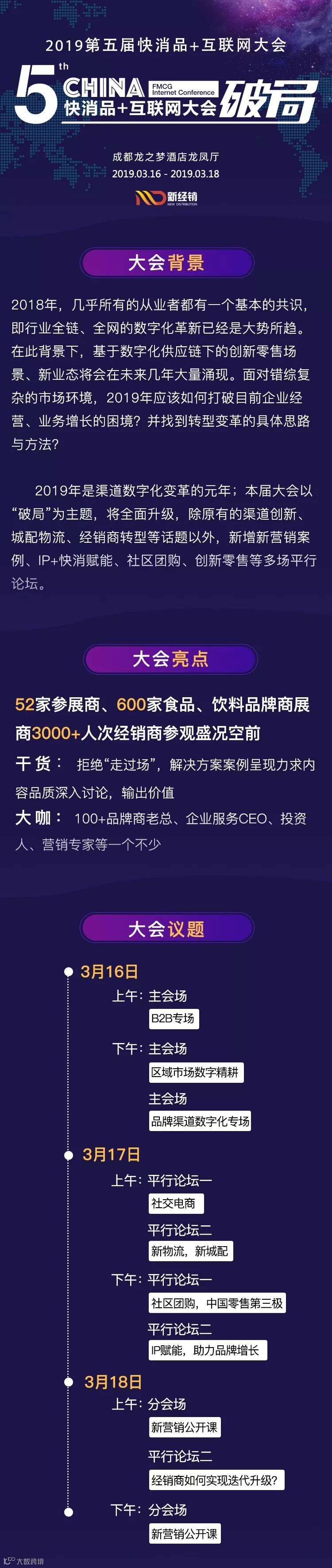 新经销将于3月16日-3月18日成都春季糖酒会期间召开2019年(第五届)快消品+互联网大会。本次会议,我们将围绕“破局”话题,与众多品牌商、供应链服务商、经销商、零售商等展开深入探讨。