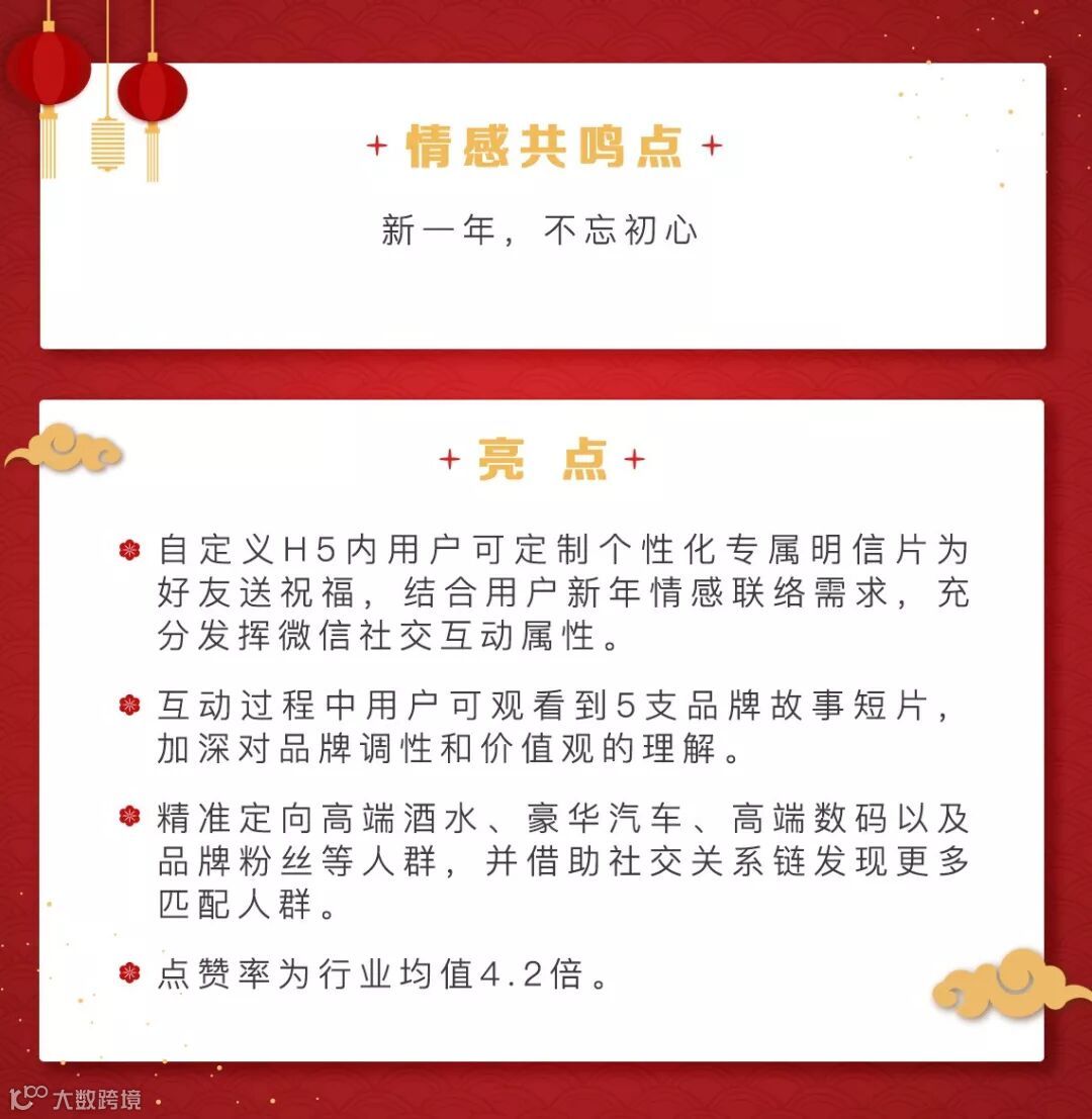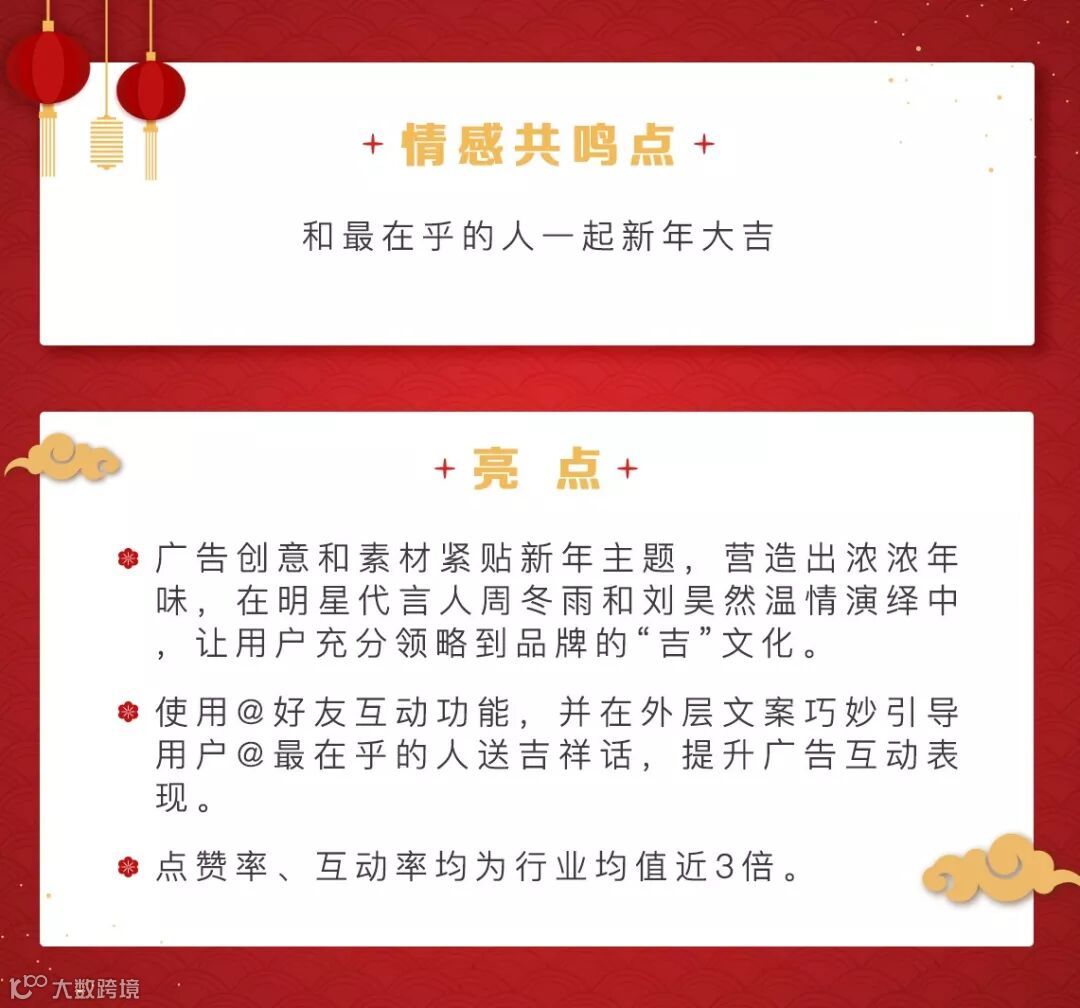 元旦春节是中国人社交和联络情感的高峰期,品牌可以借助社交媒体和像朋友圈广告@好友 这类社交助力工具,更好地利用人们的社交需求带动品牌传播,扩大影响力。
