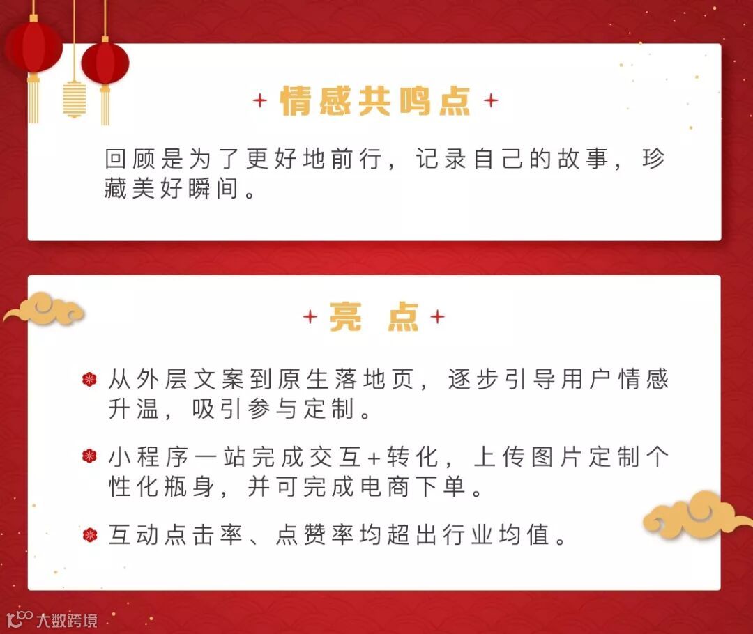 江小白用回忆讲故事。借助小程序强大的交互能力,用酒瓶瓶身为消费者私人定制专属故事,鼓励用户回顾过去一年中的美好回忆并参与互动,用小程序构建闭环。