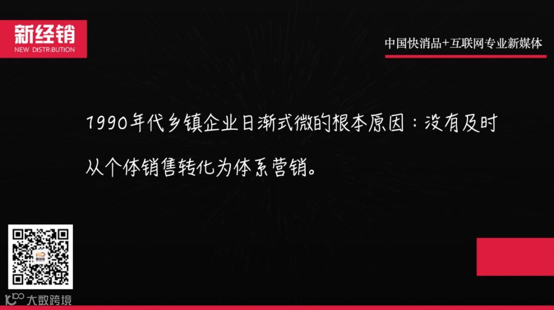 进入1990年代,中国的宏观环境情况发生了变化:一是意识形态上不再排斥民营企业,迎来了民营企业发展的黄金时期;二是中国经济开始从短缺走向平衡,甚至出现过剩。在中国商业基础极度薄弱的条件下,如果企业不系统地导入营销,不要说发展,生存都是问题。1990年代乡镇企业日渐式微的根本原因,就是整体上,它们没有及时从个体销售转化为体系营销。