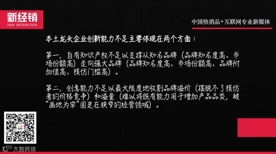 创新能力不足主要体现在两个方面。其一是自有知识产权不足以支撑它们从知名品牌(品牌知名度高、市场份额高)走向强大品牌(品牌知名度高、市场份额高、品牌附加值高、模仿门槛高)。其二是创意能力不足以让它们最大限度地收割品牌溢价(摆脱不了模仿者的价格竞争)和溢量(难以将既有能力用于增加产品品类,被“画地为牢”固定在狭窄的经营领域)。