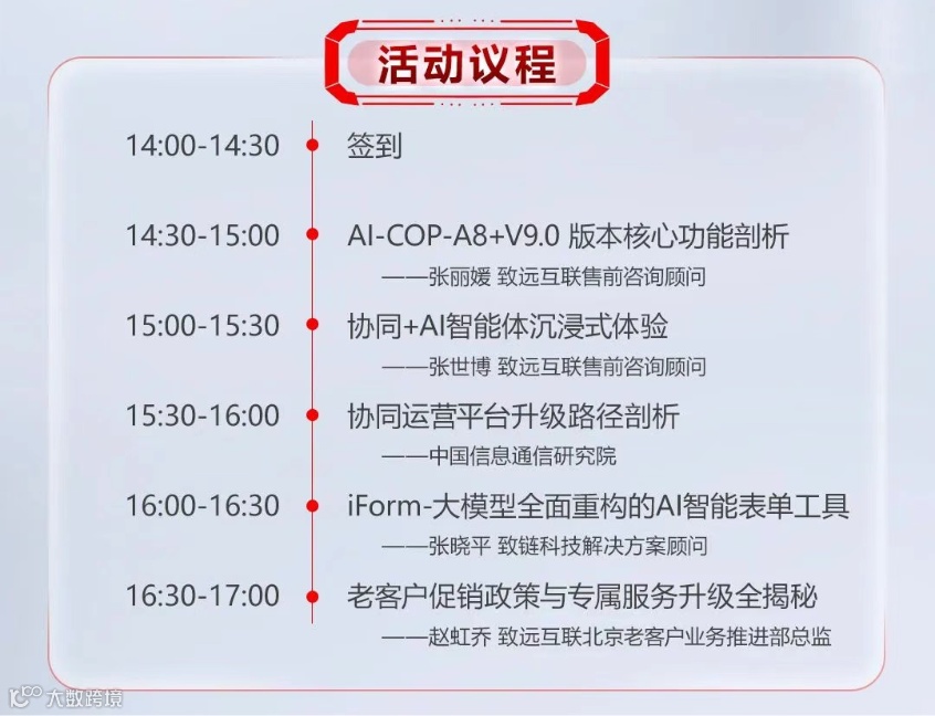 感谢您报名参加北京致远举办的“数智升级·共创未来——数智协同新品体验会”,为协助您顺利参与,特整理此《参会指南》,如仍有其他疑问和要求,您可直接与活动联系人联系,我们将竭诚为您服务。