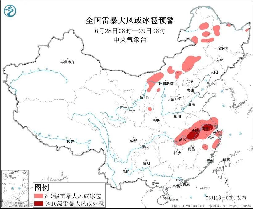 图2 全国雷暴大风或冰雹落区预报(6月28日08时-29日08时)