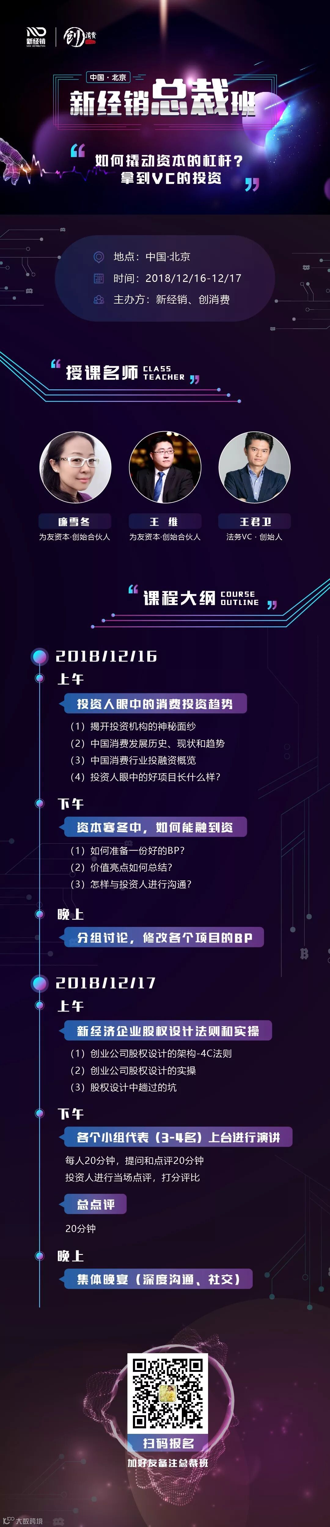 PS:2018年12月16-18日,新经销在北京举办一场零距离与资本面对面的总裁班,2天时间,从专题探讨,到课堂实操,大咖点评,通过行动学习,手把手帮你修改BP,轻松搞定VC。本次活动仅限50人,有兴趣的朋友可以长按识别下方二维码或点击阅读原文一键报名!