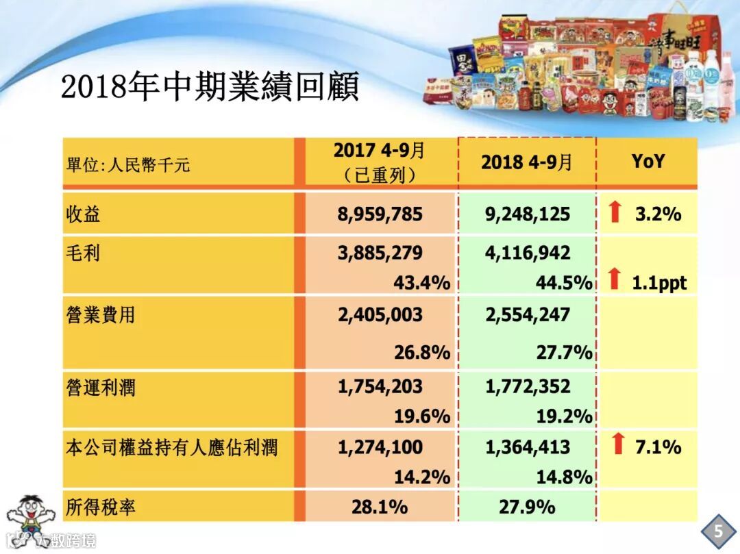 2018财年上半年,乳品及饮料类收益较去年同期成长2.8%,达到46.903亿元。该板块业绩占比90%以上的“旺仔牛奶”收益同比成长达到3.3%,且在传统及新兴等所有渠道均实现成长。