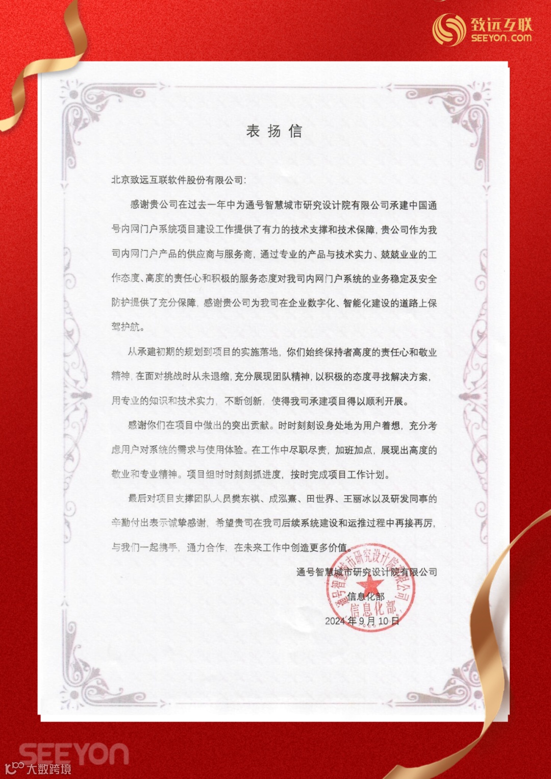 秋风送爽,金桂飘香,九月,致远互联北京区收到了来自通号智慧城市研究设计院有限公司(简称“通号智慧城市”)的表扬信。作为中国铁路通信信号股份有限公司(简称“中国通号”) 在智慧城市及信息化领域的先锋力量,通号智慧城市积极探索企业数字化的新边界,并与致远互联携手,共同致力于中国通号数智化建设。