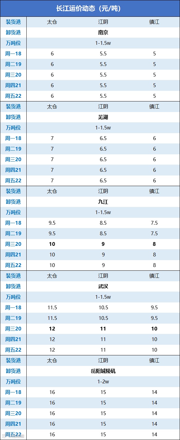 周五镇江到淮安单机1-2千吨的运价为9元/吨,2-3千吨的运价为7元/吨,拖队8-10千吨的运价为10元/吨;