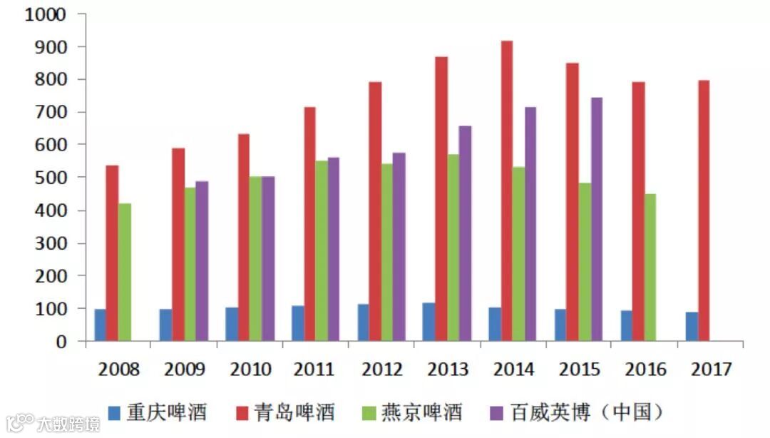 由于国内啤酒消费终端表现不佳,2014 年之前行业内持续扩产的策略已经不再适用,从2015 年开始,各大啤酒企业停止扩张产能,同时关停小规模、低效工厂。百威英博关闭了在舟山的工厂,华润啤酒也于2015 年关闭3 家、2016年关闭7 家工厂;珠江啤酒于2017 年3 月关闭生产低端瓶装啤酒的汕头工厂;嘉士伯于2016 年在中国关闭17家工厂,旗下重庆啤酒也于2014-2016 年对部分亏损的分公司或子公司进行关停或出售处理。