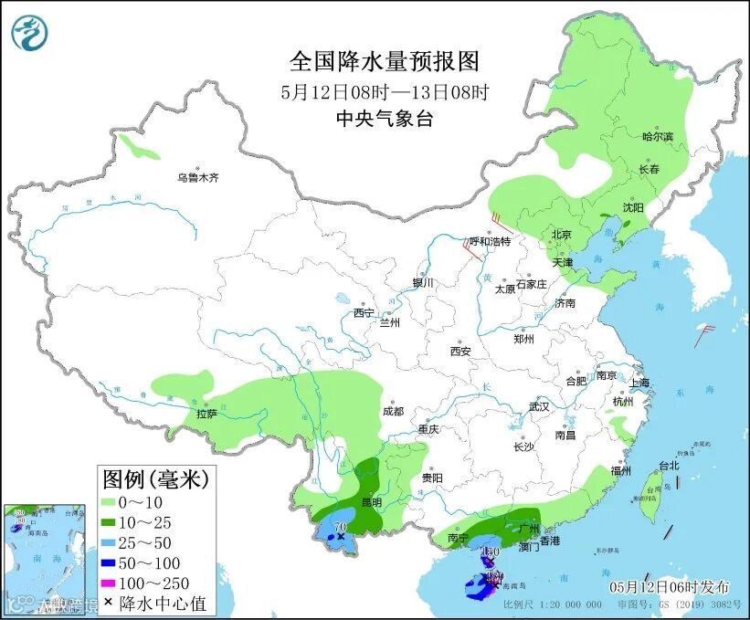 12日至13日,广东中西部、广西东部、海南岛、云南西部和南部等地的部分地区有中到大雨,局地有暴雨或大暴雨。上述局部地区伴有短时强降水(小时降雨量30~50毫米,局地可超过60毫米),云南南部等地的局地有雷暴大风或冰雹等强对流天气。