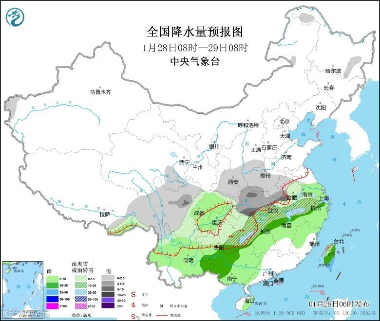 受冷暖空气的共同影响,1月28日至29日,我国中东部地区将出现雨雪天气。青藏高原东部、西北地区东部、黄淮西部和南部、江汉、江淮、江南西部和北部及贵州中北部等地有小到中雪或雨转雪,其中,湖北、安徽、江西北部、浙江北部、湖南北部、贵州北部等地的部分地区有大到暴雪,安徽南部、浙江西北部等地局地有大暴雪。贵州、湖南中西部、江西西北部等地的部分地区有冻雨。