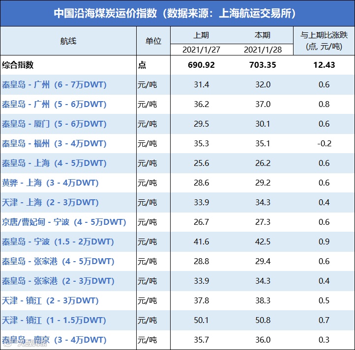 昨日市场商谈维持小幅涨势,进江货盘少量释放部分船型继续上涨。春节假期模式开启,工厂停工冬奥会环保要求等影响,电厂日耗及沿海干散拉运需求持续回落。而随着船舶停航增多,在天气和疫情影响船舶周转、船员换班等不可控因素下,沿海散货运输呈现船货两弱,但保持小幅探升状态。