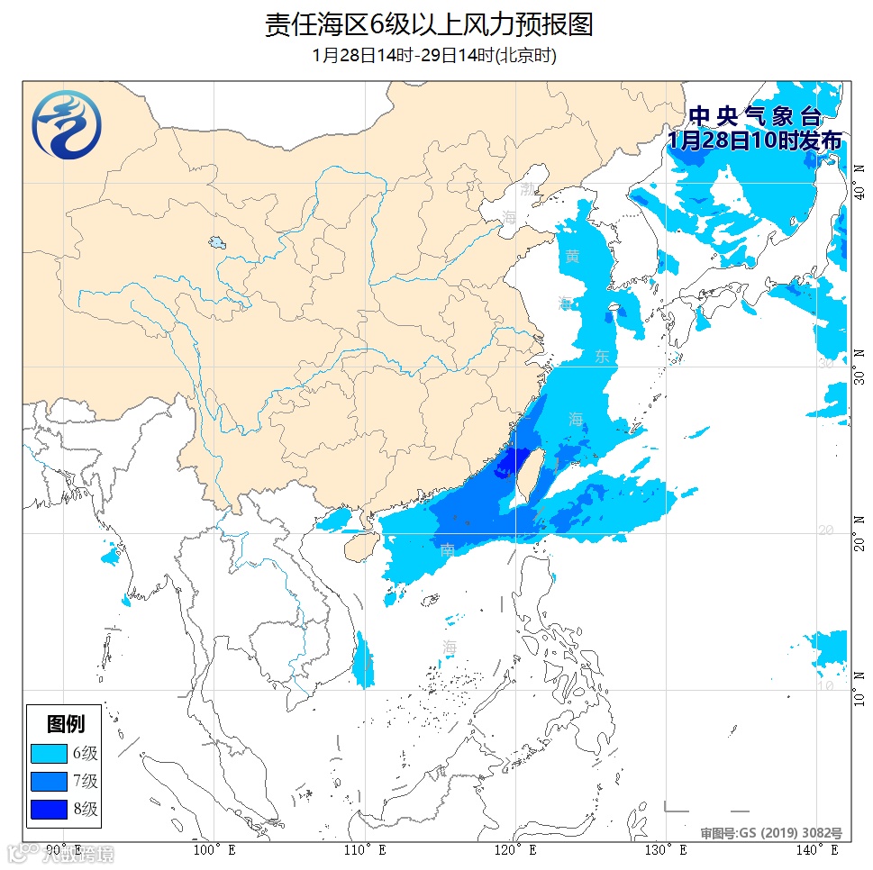 28日中午至29日白天,受冷空气影响,黄海东部海域、东海大部海域、台湾海峡、台湾以东洋面、巴士海峡、南海北部海域、北部湾将有6~7级、阵风8级的偏北风或东北风,其中台湾海峡的部分海域风力可达8级、阵风9级。