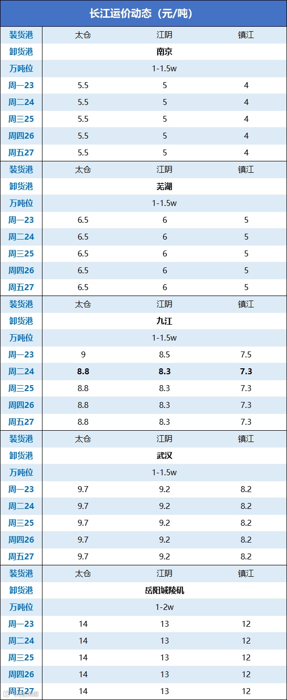 镇江到徐州单机1-2千吨的运价为15元/吨,单机2-3千吨的运价为13元/吨,拖队8-10千吨的运价为12元/吨;