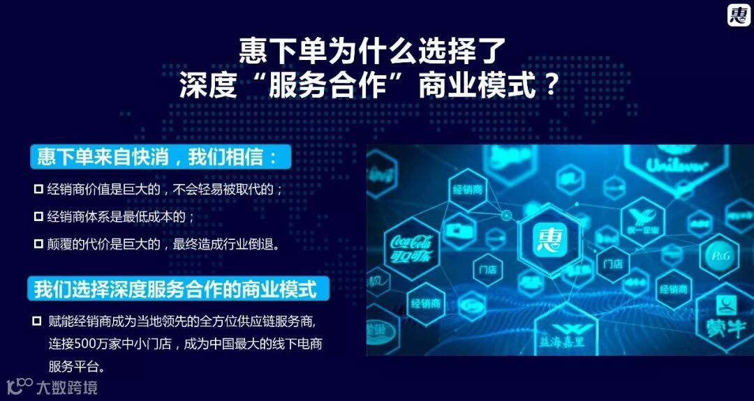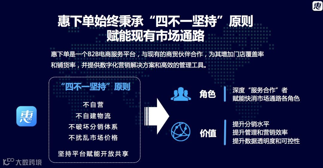 为什么?再次跟大家分享一下,惠下单的基本原则,也是我们公司的核心理念,叫“四不一坚持”,可能和大家所了解的很多B2B有点不一样,我们是一个服务平台,不是做交易的平台。因为我们公司是做SASS服务发展起来的,所以我们的基因和擅长是提供技术提供服务。我们与现有的经销商合作,增加他们门店覆盖的数量和质量,提供数据化的营销解决方案,提供客户管理和人员管理工具,我们认为服务好有意愿转型升级的经销商,这些经销商将贡献给品牌商更好的价值,从而我们就可以更好服务品牌商。