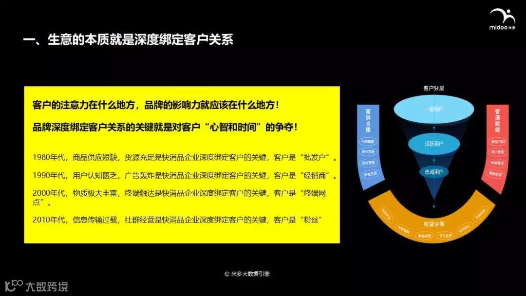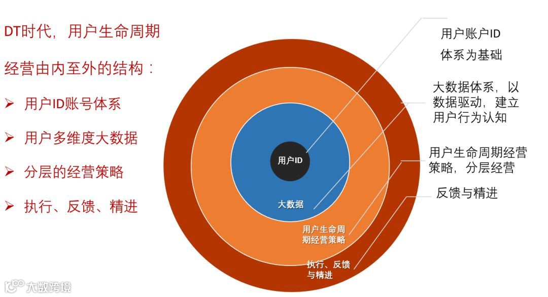 这也说明了一个问题:凡是越早以用户为核心和重视用户数据的企业,其价值越快迭代到新的估算模式,就是:用户数据x用户数量=企业价值,这时候提升商业效率的核心就变成了:用户的数据,匹配不同的场景营销决策,因人(群体)而异制定策略,最终实现用户全生命周期的持续经营。