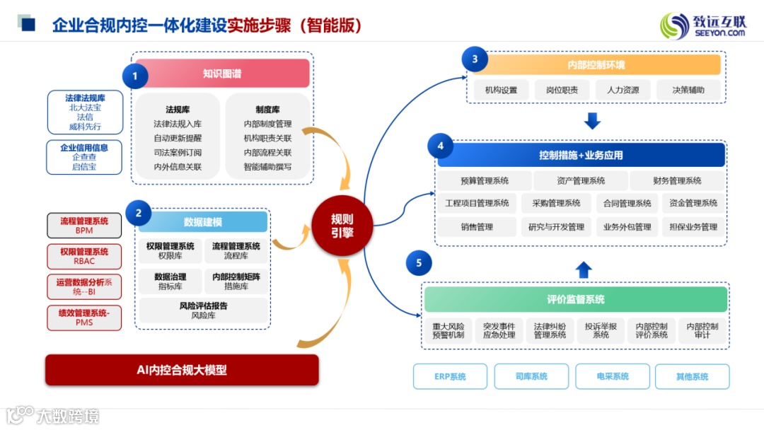 企业合规内控一体化的信息建设一般通过5个步骤来实施。步骤一是构建知识图谱,形成法规库和制度库,让人知道要遵循哪些规定;第二步就是数据建模形成权限库、流程库、指标库、措施库、风险库等;第三步将知识和数据建模结合起来,搭建规则引擎,让系统知道要遵循哪些规定;第四步,通过规则引擎将合规、内部控制措施落实到业务系统中,与业务系统紧密结合;最后同时通过建设评价监督系统,反向促进内部控制体系的不断完善。