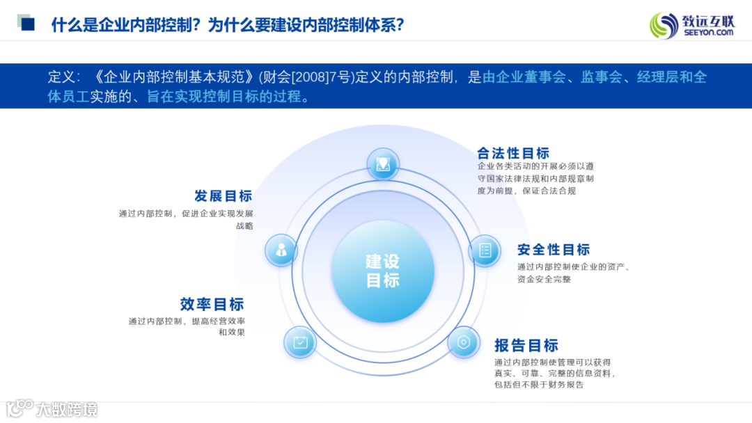 它的控制目标是以下的5个方面:第一个是合法性目标,要保证我们企业的经营是合法合规;第二个是安全性目标,通过内部控制使企业的资产、资金安全完整;第三个是报告目标,通过内部控制使管理可以获得真实、可靠、完整的信息资料,包括但不限于财务报告;第四个是效率目标,通过内部控制,提高经营效率和效果;第五个是发展目标,通过内部控制,促进企业实现发展战略。