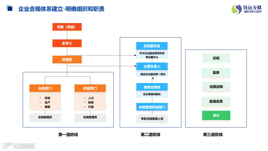合规管理中的三道防线业务部门和职能部门,第一道防线,保证他们在日常经营活动中,他们所经手的业务是合法合规的;第二道防线是合规管理的职能部门,保证公司整体的运行的合规;第三道防线是纪检监察和审计,他们要不断的在我们的企业运行的过程当中去发现问题并且纠正问题。