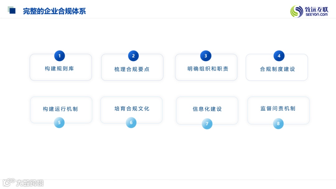 一个好的合规内控系统具备一下八种能力:知识能力化、规则数字化、场景角色化、流程措施化、要素表单化、数据可视化、方案一体化和技术智能化。