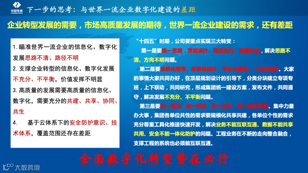 第一点,瞄准世界一流企业的信息化、数字化发展思路不清、路径不明。第二点,支撑企业转型的信息化、数字化发展不充分、不平衡,价值发挥不明显。第三点,高质量的发展需要高质量的信息化、数字化,需要充分的共建、共享、协同共生。第四点,基于云体系下的安全防护意识、技术体系,覆盖范围还存在差距。