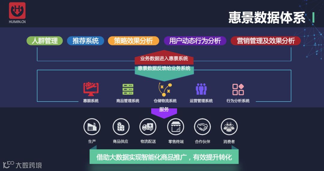 惠景,数据源是来源于惠眼,惠景是动手术的,依据于核磁共振检查出来的病症,基于对人群、对系统推荐、效率、效果的评估,在惠景的系统里面产生行动方案,会产生行为决策,然后进而对生产、商品、物流、零售、合作伙伴、消费者进行运营决策的实施,实施的结果,又会把数据返回给惠眼,进行数据新的沉淀,以及下一次实施前的挖掘。