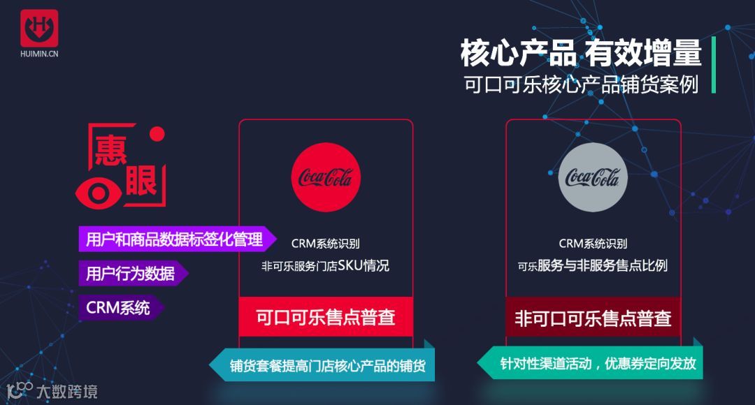 可口可乐是巨无霸品牌,在北京市场,依然有空间,这是一个大品牌新售点的开发。双方团队,一定要做1+1大于1,所以完全剔除可乐的业代线上售点,所以我们要对可口可乐的售点甄别,如果不在我们这次铺货范围之内,不要进行内耗。甄别完了之后,这个城市大概有1.9万多个售点,我们根据这些店线上积累以及线下实际调查,找出来这些店里面各种饮料的上架率,我们通通找出来,再根据不同店在惠眼沉淀的数据,我们给它不同的运营方法,冰露的做空白售点,根据每个商品在惠眼里面积累的数据间隔周期,在惠景实施的部分给它一个有效的运营手段,这些都是自动推送,当我们把历史的积累写成一个公式,基本上就能实现自动化的针对这个单品的科学运营。