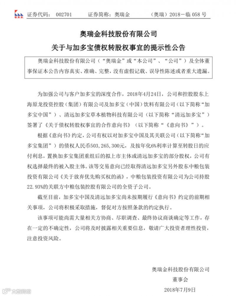 这则公告“意外”坐实了奥瑞金原来也要入股加多宝的企图。