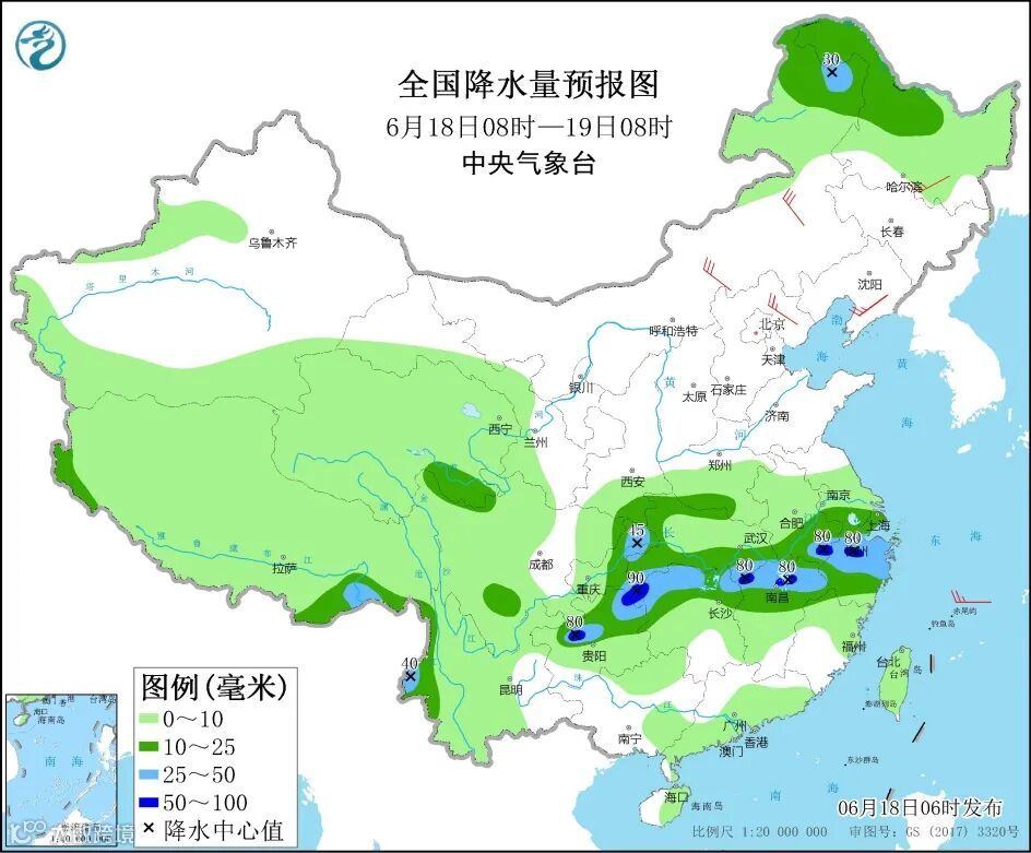 未来三天,受低层切变线影响,西南地区东部、江南北部等地的部分地区有大雨或暴雨,局地大暴雨,并伴有短时强降水或雷暴大风等强对流天气。其中,6月18日08时至19日08时,内蒙古东北部、重庆北部和东南部、贵州东北部和西部、湖北南部、江南北部等地的部分地区有大雨或暴雨,局地有大暴雨(100~160毫米),并伴有短时强降水或雷暴大风等强对流天气。中央气象台18日06时继续发布暴雨预报。