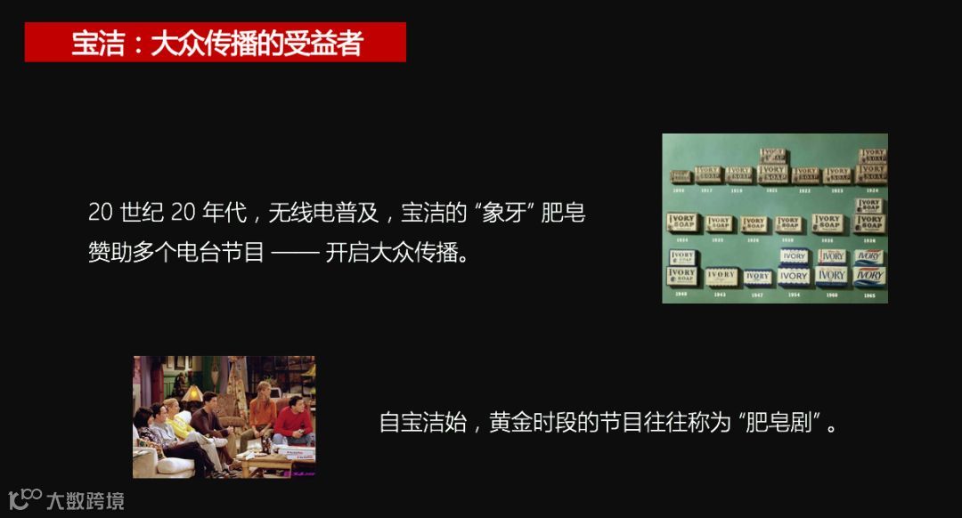 在20世纪20年代,宝洁利用无线电播放它的象牙肥皂,在黄金时段节目播广告(宝洁),所以把黄金时段的节目叫肥皂剧,是因为跟宝洁有关系。宝洁原来是一家小企业,实际上就是因为它率先利用了大众传播的红利。传播会将影响力放大,那么谁会利用大众传媒,谁就能享受传播的红利。只不过现在的传播红利从传统媒体走向新的媒体。