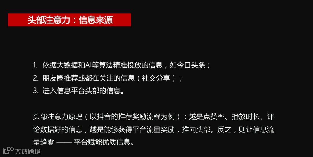 因为你的这些行为被平台纳入大数据,决定是把它放到头条去,还是让它OUT,大家把它忘了。这个就叫头部注意力。我们传的时代和播的时代差异,播的时代花钱少了,没有效果。传的时代是只要达到不了头部注意力,没有效果。所以它最终的结果是两个字“引爆”。