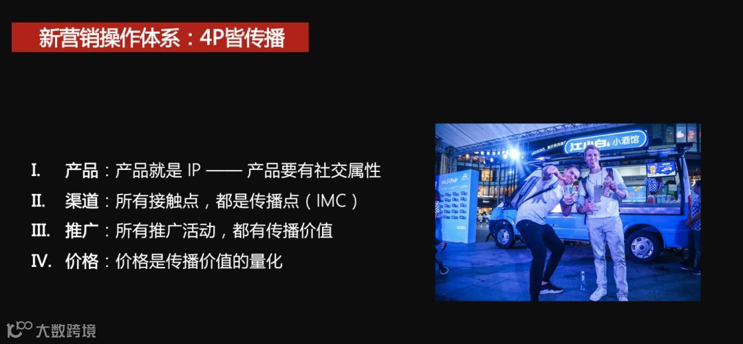 最后一个是操作系统。传统营销框架里面叫4P。4P皆传播,如何做?把所有的事情做的都有传播力,按照过去的4P总结了四句话。