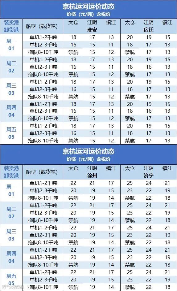 镇江到济宁单机1-2千吨的运价为21元/吨,单机2-3千吨的的运价为19元/吨,拖队8-10千吨的运价为18元/吨。