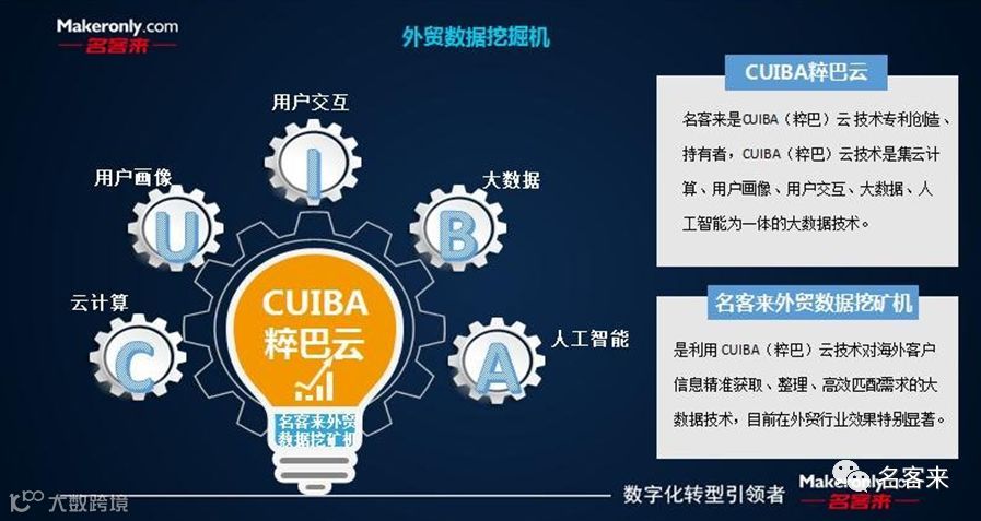 CUIBA(粹巴)技术是名客来结合自身在外贸行业的数十年实践经验及全球大数据分析的最佳实践创造的最新的数字技术,也是名客来平台赖以生存的核心关键。名客来是CUIBA(粹巴)技术专利创造、持有者。期初仅对名客来自身外贸团队提供服务,后期由于效果显著,逐步应用于名客来平台(makeronly.com)。近几年由于云计算的快速发展,名客来团队将CUIBA(粹巴)技术进行云化,形成了“粹巴云”服务产品,对不同的外贸企业提供云端服务,“粹巴云”具有使用费用低、数据鲜活、需求精准、日日更新、询盘数量大等特点,按照企业收到的询盘进行计费,避免了外贸企业资金浪费,据不完全统计“粹巴云”会员每天可以收到近100个询盘,让外贸人员不愁没有业务。