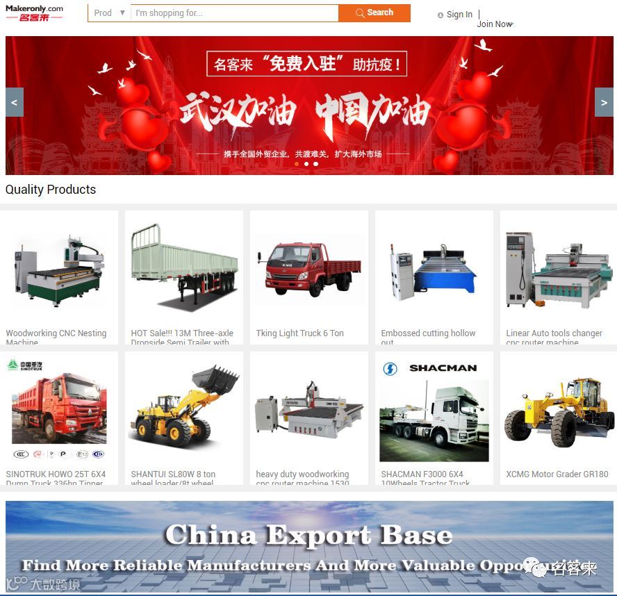名客来平台(makeronly.com)是全国首家M2B平台,据德国莱茵TÜV集团调查报告显示,凭借其独自研发的CUIBA(粹巴)大数据技术,截止2017年9月名客来已经成为中国toB类第四大跨境电商平台。截止2019年底入住企业多达35000家,主要涵盖车辆、机械、矿物与冶金、农业与食品、建筑产品、化工、渔业等行业,其中包括魏桥纺织、中国重汽、徐工集团、临工集团、山东钢铁、兖矿集团等众多大中型企业,年撮合交易60亿美元。平台先后荣获“最具创新互联网企业” 、“最受欢迎创新成长企业”等大奖,平台会员借助CUIBA(粹巴)大数据技术可以获得源源不断的鲜活询盘。平台其他服务包括:智慧企业解决方案、跨境电商平台构建及大数据运营、企业海外数字化精准营销、产业集群数字化转型升级、外贸综合服务、外贸培训等。