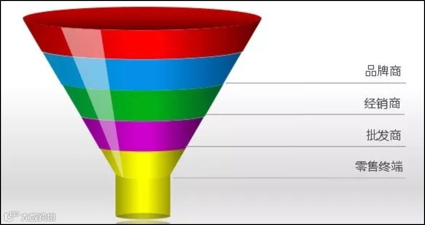 1、从品牌商到消费者,商品总体呈现漏斗形状,自品牌商向下的平台建设会有不可调和的矛盾。并且品牌于渠道和消费者的影响力,越向下越小。