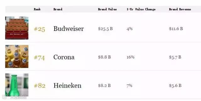 啤酒行业有三个上榜品牌,分别是百威、科罗娜与喜力。
