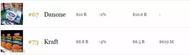 包装食品中上榜的品牌包括:雀巢、达能、卡夫食品。