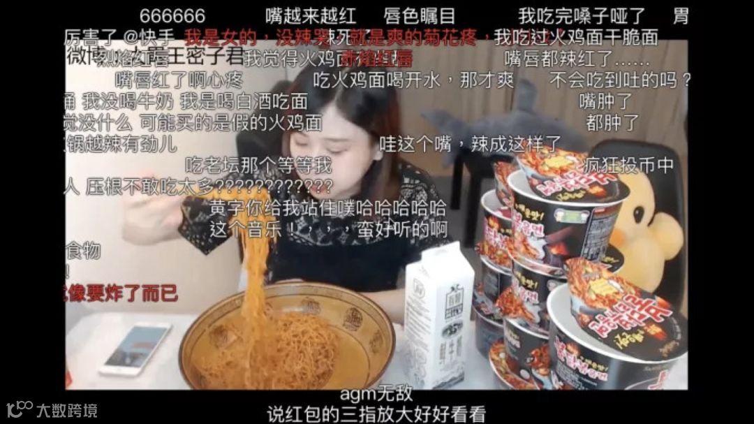 围观直播过程:很多“XXX吃了X碗火鸡面”的热播视频,内容不外乎都是博主在挑战吃播火鸡面。“前面是甜味,后面是辣味”、“这辣味也许这辈子都会铭记在心”……博主们边吃边用逐渐被辣肿的嘴形容这火鸡面究竟有多辣。满屏的弹幕,也都在讨论它究竟辣不辣,以及作为重庆、四川、上海、山东等地人,究竟能不能承受这种辣。很多人表示好奇想试试,并随手就在网上下了单。