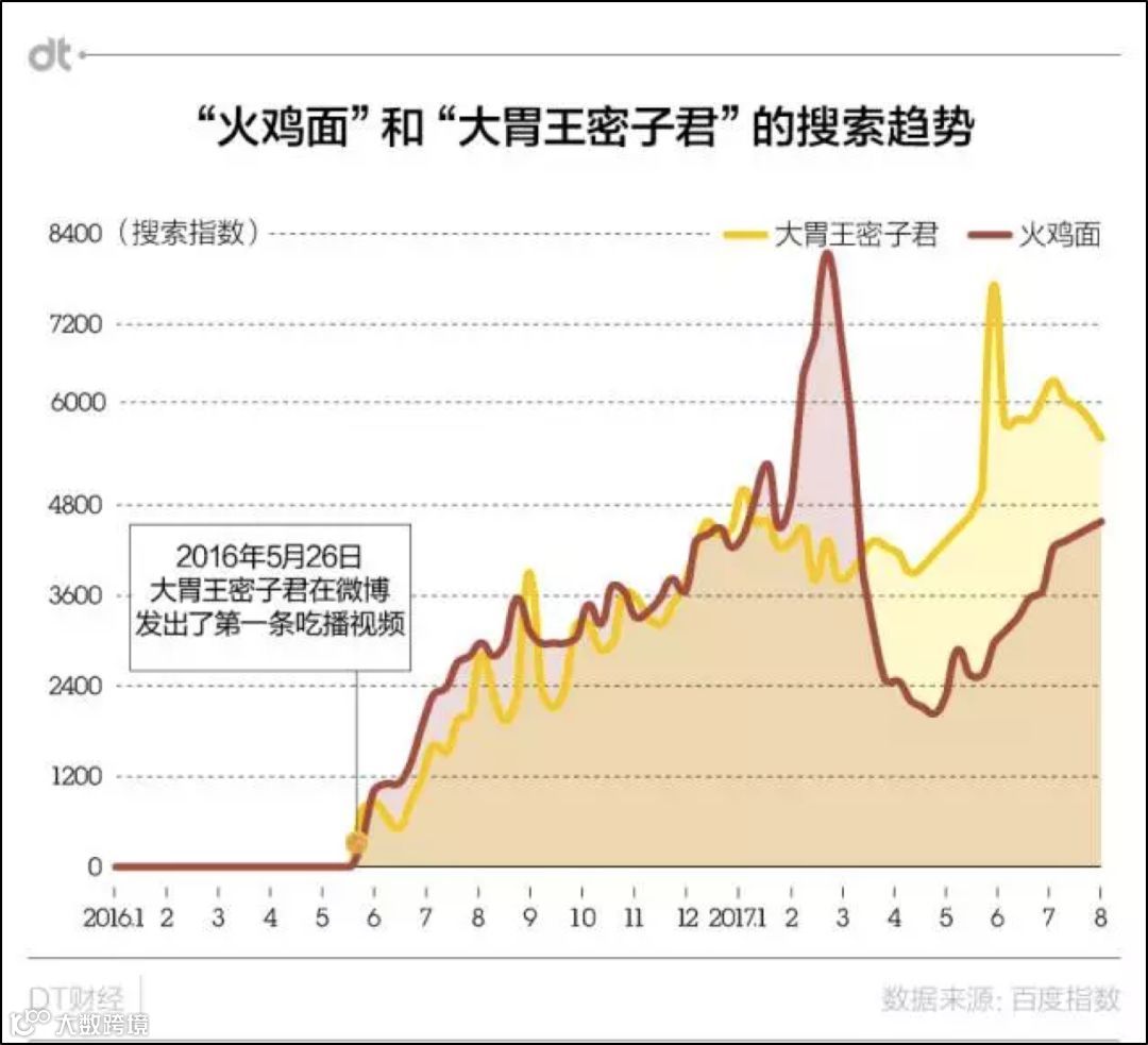 年轻用户群体围观吃播发泄情绪(解压)的同时,往往也跟随节目对食物本身产生兴趣,尤其是火鸡面这种自带“到底有多辣”话题,更激发消费群体的下单热情。百度指数显示,从2016年5月开始火鸡面搜索呈现指数式增长。