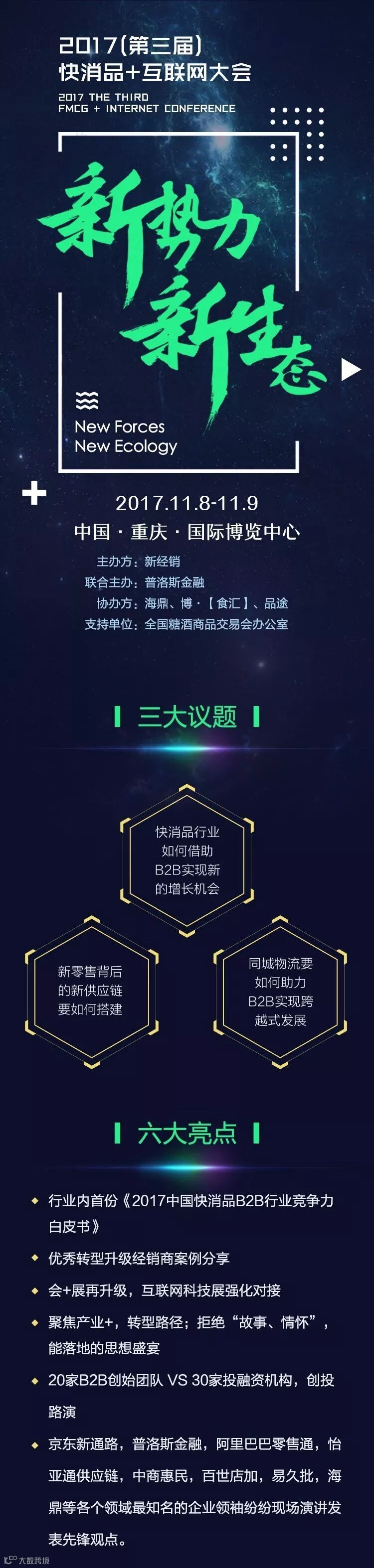 第三届(CFIC)中国快消品+互联网大会将于2017年11月份在重庆举办,大会将紧密围绕“新势力,新生态”主题,邀请国内1000+经销商,500+品牌商,200+家B2B平台的创始人,100+投融资机构,共同探寻跨界融合的新篇章!