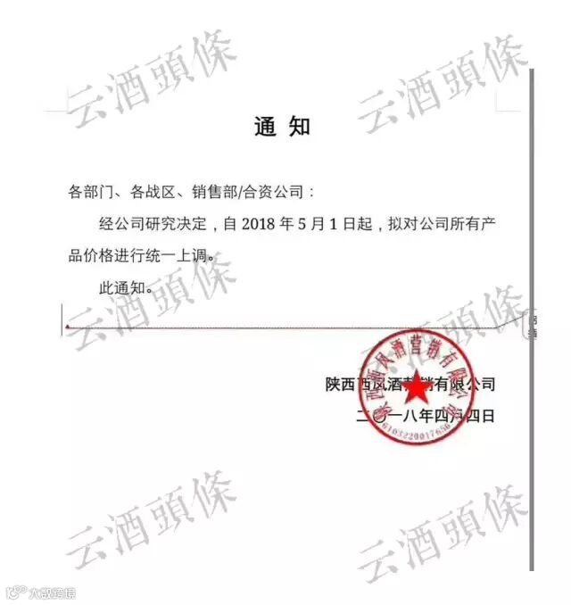 4月9日,有经销商陆续接到西凤酒营销有限公司下发提价通知。通知显示,自2018年5月1日起,拟对公司所有产品价格进行统一上调。