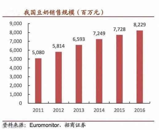 近年来,中国消费者越来越追求健康的生活方式。作为典型的植物蛋白饮料,豆奶的健康属性被广泛认可。一般而言,豆奶有四种消费形式:低温豆奶、常温即饮豆奶、豆奶粉和散装销售 (现磨豆浆等),整体规模已过1000亿。其中,常温即饮豆奶风头最为强劲。数据显示,目前国内即饮豆奶市场规模约近100亿(年增长已达10%),我们推测未来,更可能会以30%的速度高速增长,消费体量将居全球首位。