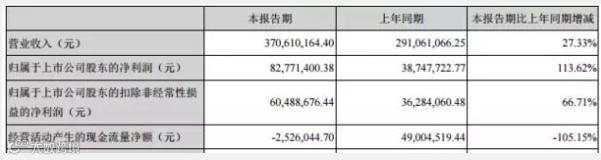 酒鬼酒股份有限公司披露2017半年报称,公司2017上半年实现营业收入3.706亿元,同比增长27.33%;实现归属于上市公司股东的净利润8277万元,同比增长113.62%。