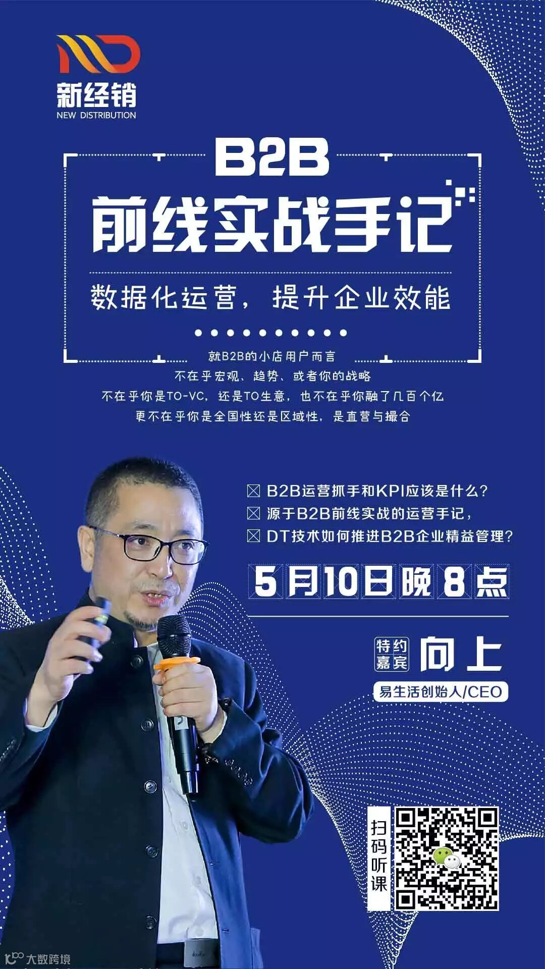 PS:5月10日(本周四)8点,我们邀请易生活创始人&CEO向上在新经销公开课社群内讨论《B2B前线实战手记—数据化运营,提升企业效能》,内容将围绕以下内容分享: