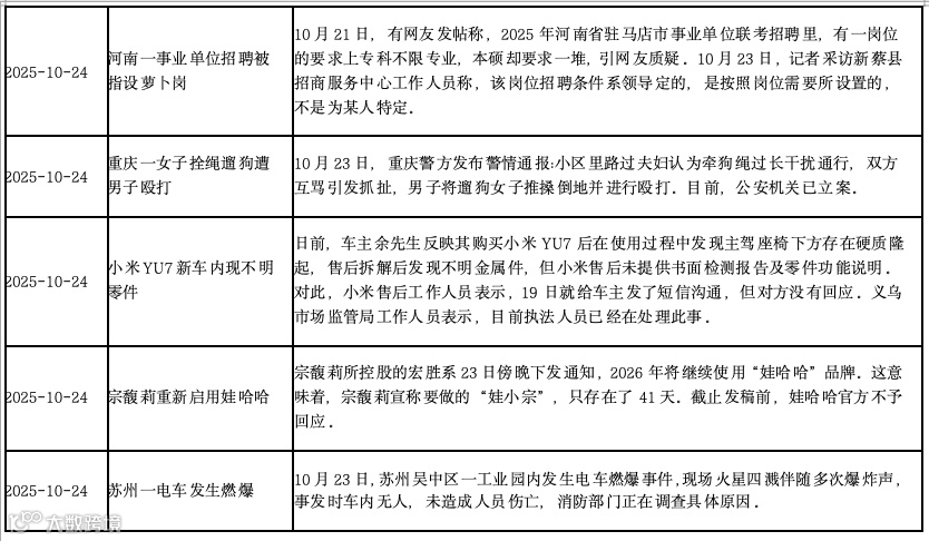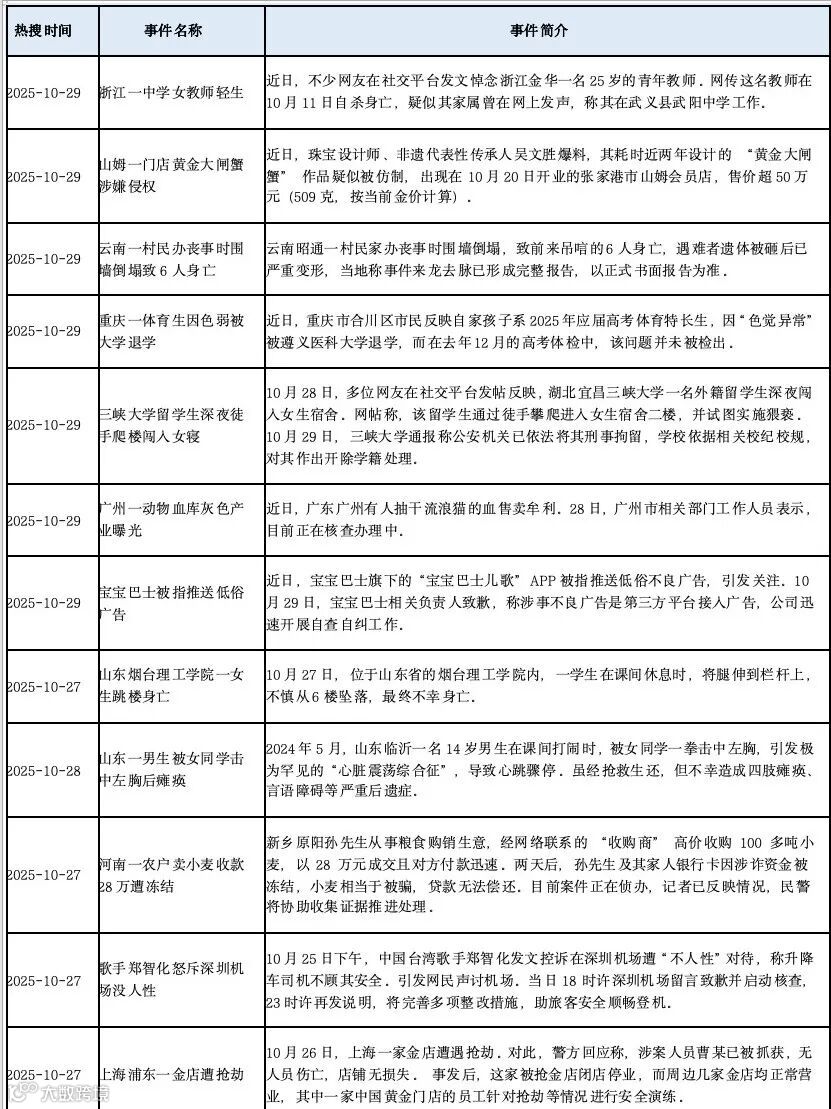 2025年10月下旬, 一系列涉及教育、公共安全、商业诚信、涉外管理等领域的事件在舆论场集中涌现, 勾勒出一幅复杂的社会风险图景。本报告旨在梳理这些热点事件的内在联系, 剖析其折射的深层社会心态与治理挑战, 并为相关方提供前瞻性的研判建议。