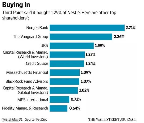 美国投资者Daniel Loeb旗下的对冲基金Third Point LLC表示已累计购入雀巢公司35亿美元股份,这些股份相当于雀巢约1.25%的股权。此外Third Point还向雀巢公司施压要求其出售所持的欧莱雅23.3%股份。