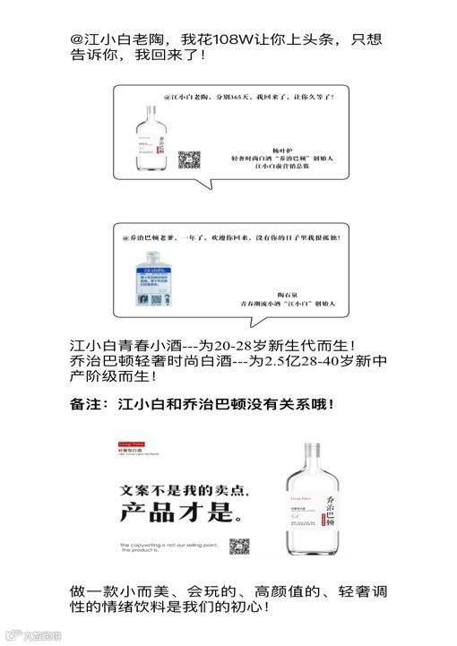 结合杨叶护的个人履历,再加上这次“午夜喊话”,对于“乔治巴顿”,很多人无法不联想到江小白。但无论是从定位而言,还是着眼于产品本身,这位新选手都有着与江小白严格区分的自身特色。
