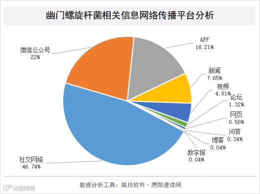 依托于蚁坊软件鹰眼速读网全网舆情监测系统,选取了2021年12月——2022年2月这三个月期间内,网络中关于幽门螺旋杆菌信息传播网络热度的数据情况,并据此分析其网络传播热度的演化趋势。从上图其网络热度趋势的演化来看,总体上,这三个月期间网络中幽门螺旋杆菌信息数据体量较大,且呈现出多起伏的传播态势。从具体热度峰值的信息传播来看,12月16日,“胡兵治疗幽门螺杆菌全纪录”这一话题引发公众关注;12月30日,“接吻会传播幽门螺旋杆菌”这一带有吸引力的细节信息也产生了小的热度峰值;1月5日,“美国将幽门螺旋杆菌列为明确致癌物”这一话题引爆网络;1月13日,“查出感染幽门螺杆菌该怎么办?”、“近一半胃癌与幽门螺杆菌有关”、“昂贵抗幽牙膏是智商税”、等相关信息相继传播,也引发了一阵关注高潮;1月20日,“幽门螺旋杆菌感染者患胃癌危险性加倍”、“幽门螺旋杆菌自测产品出现”等信息推动形成热度小峰值;2月17日,“你被幽门螺旋杆菌概念收割了吗”这一话题成为网络关注的重点,引发热议;2月27日,“幽门螺旋杆菌为何‘阴魂不散’、“刷牙或能传染幽门螺旋杆菌”等信息再次掀起网络传播热度的高潮,并形成高热度峰值。